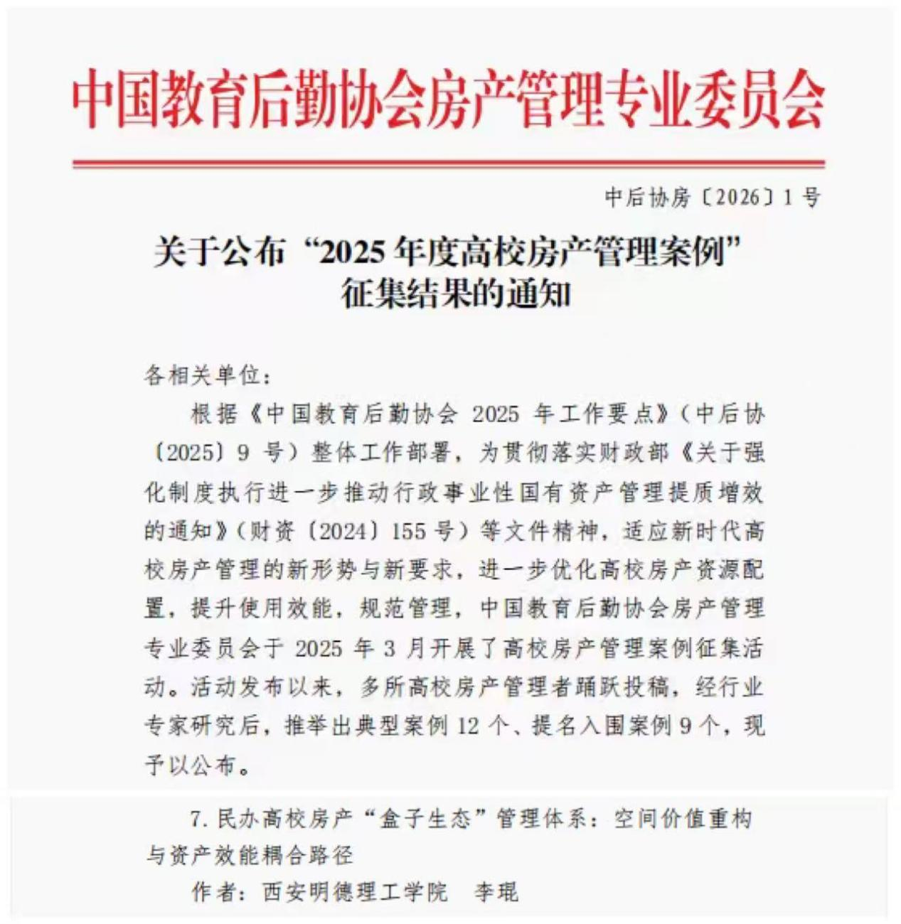 近日,中国教育后勤协会房产管理专业委员会公布2025年度高校房产管理案例评选结果,世界杯官网资产管理处申报的《民办高校房产“盒子生态”管理体系:空间价值重构与资产效能耦合路径》成功入选。这标志着世界杯官网在房产资源...