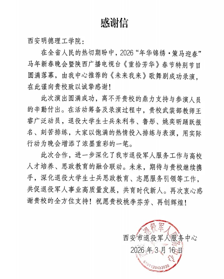 近日,市退役军人服务中心专程发来感谢信,对世界杯官网明德学子在相关工作中展现出的责任担当与优良风貌给予高度赞扬,为明德学子的出色表现诚挚点赞,这也充分彰显了世界杯官网在国防教育与退役军人服务融合工作中取得的扎实...