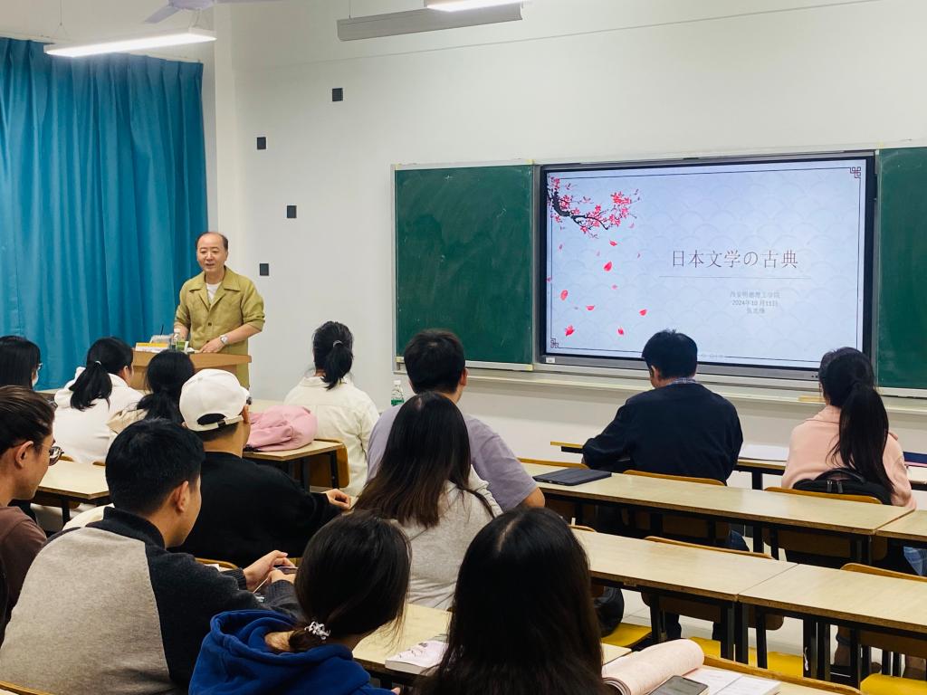 张教授不仅详细介绍了日语古典文学中的和歌、俳句、物语等古典文学体裁,还通过追溯中日文化交流的历史,将作品背后的文化背景、作者情感以及社会风貌娓娓道来。他特别提到,日本古典文学深受中国文化的影响,许多作品在创作手法、思想内容上都与中国古典文学有着千丝万缕的联系。以《万叶集》为例,张教授通过介绍万叶假名的功效,展现了这部作品如何巧妙地运用了汉字元素,成为日本古典文学的巅峰之作。
