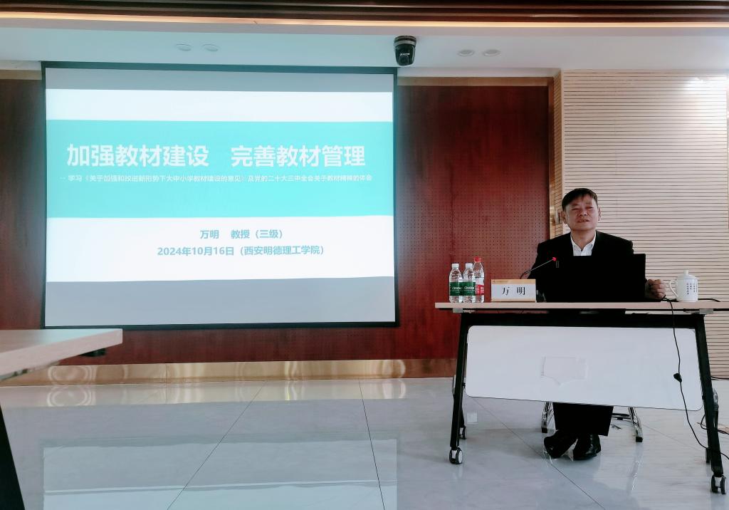 会议伊始,教务处副处长任华阐述了本次讲座的意义,并对万明教授进行了介绍。接着,万明教授以自己丰富的教材研究经验,从教材选用制度、规范,教材建设内涵以及教材建设存在的问题等多个角度对教材建设进行了详细讲解。最后,教务处副处长任华作总结。他表示,本次培训内容丰富,专业性强,对学校教材建设工作具有十分积极的意义。学校将以本次培训为契机,继续为广大老师出版教材搭建学习与交流的平台,提供保障,力争学校高水平教材建设实现新突破,取得新成绩。
