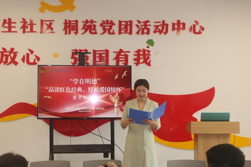 “时维九月,序属三秋。四时俱可喜,最好新秋时”,秋日正是读书好时节。为庆祝中华人民共和国成立七十五周年,深入学习贯彻习近平新时代中国特色社会主义思想和党的二十届三中全会精神,激励广大明德师生坚定理想信念,牢记初心使命,10月16日下午,学校组织开展“学在明德”之“品读红色经典、厚植爱国情怀”读书分享会,教师和同学们齐聚一堂,共同分享在书中所阅读到的收获与感悟。本场读书分享会由党委学生工作部、马克思主义学院以及校学生会同共举办。