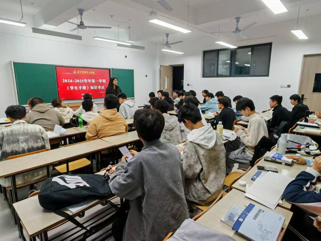 本次考试由辅导员组织2024级全体同学集中在自习教室进行,考试内容以高校学生行为准则、学生管理规定等为主,通过单选、多选题型对学生的学习情况进行综合考察。