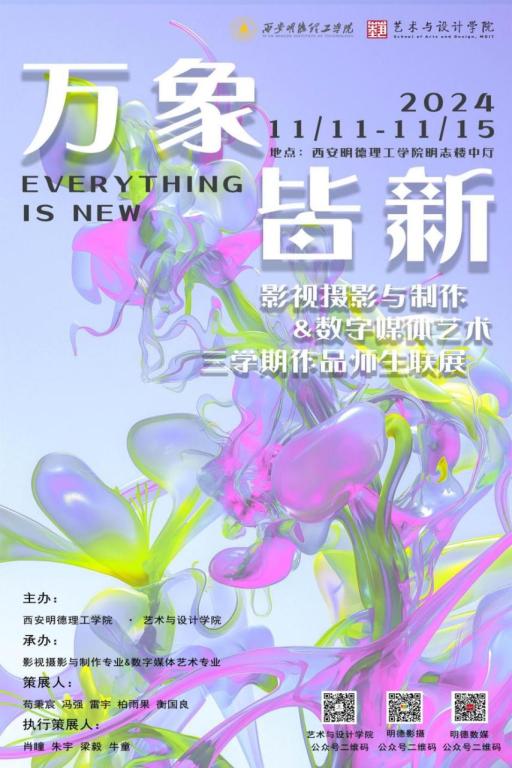 11月11日至15日,由艺术与设计学院主办,数字媒体艺术专业与影视摄影与制作专业联合承办的“万象皆新·三学期师生作品联展”在明志楼中厅成功举办,并圆满收官。此次盛会不仅汇聚了学院内的精英师资与才华横溢的学生,艺术与设计学院院长苟秉宸、党委书记兼行政副院长雷宇、副院长冯强以及大师工作室特聘教授柏雨果等众多领导与师生也亲临现场并观看展览。