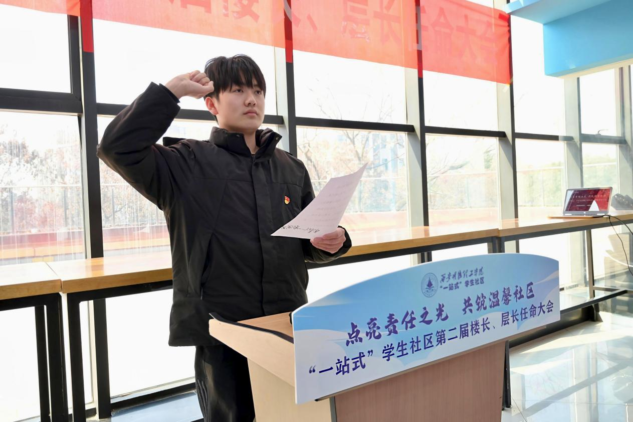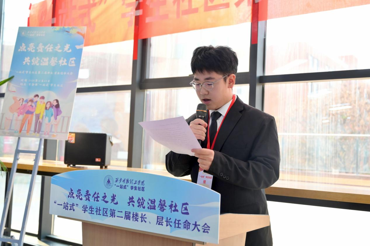 荷苑北三层层长耿子越作为楼层长代表发言。他表示楼层长们将以“自我管理、自我服务、自我教育、自我监督”为原则,围绕学校中心工作,全心全意为社区同学服务,以坚定的身姿传递温情,用青年人的担当奉献精神,为世界杯官网“一站式”学生社区综合管理模式以及宿舍网格化管理贡献青春力量。