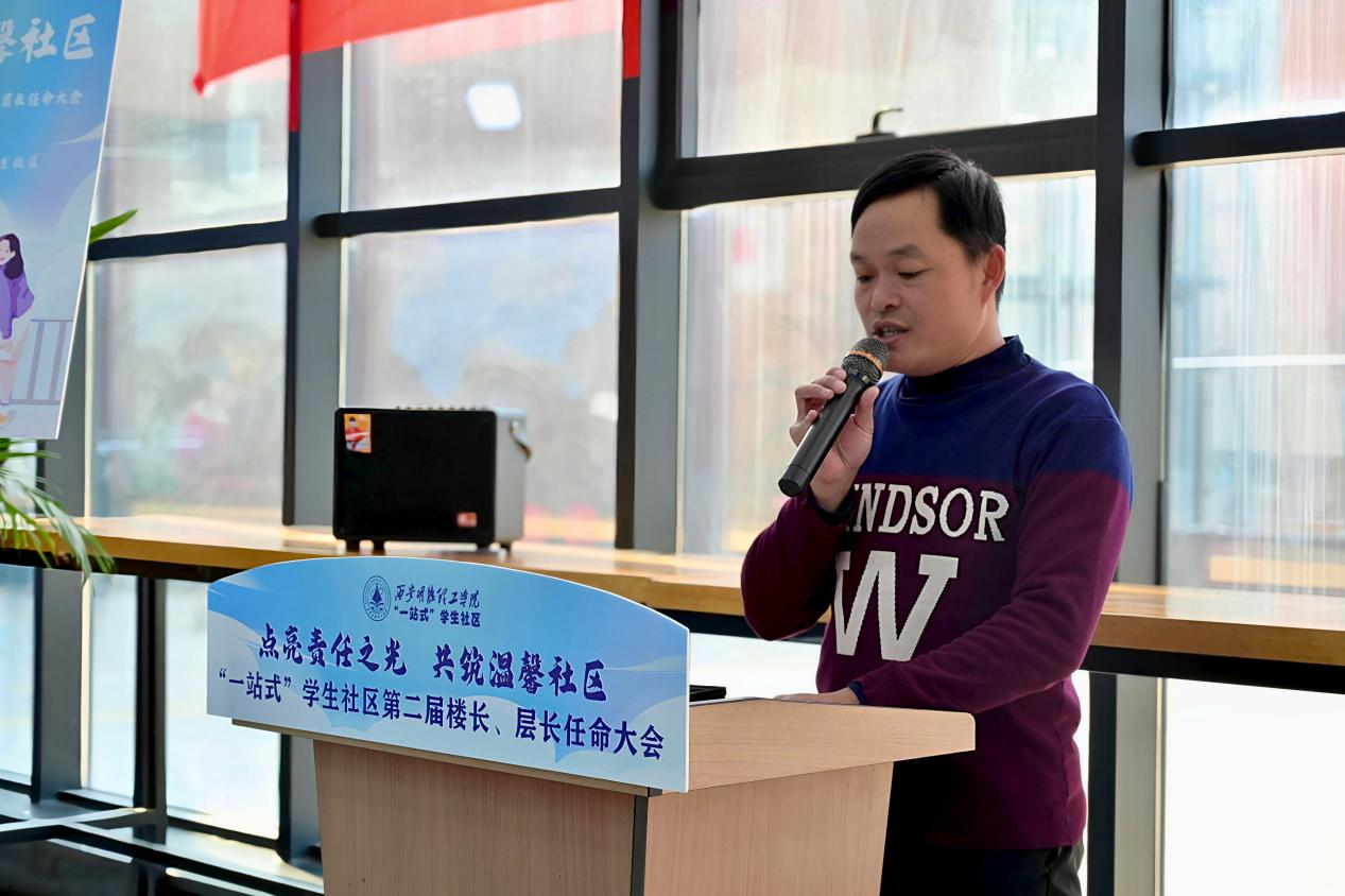 最后,党委学生工作部副部长童杨梓讲话。童杨梓老师充分肯定了楼层长在宿舍管理工作中的重要作用和贡献,接着他对全体楼层长提出了三点要求:一是要发挥模范带头作用,在学业、品德、行为规范等各方面以身作则,为同学们树立榜样;二是要强化服务意识,主动了解同学们的困难诉求,及时反馈、协助解决,让社区充满温暖关怀;三是要创新工作方法,积极组织各类文化、学习活动,增强社区凝聚力与活力,打造各具特色的楼层文化。