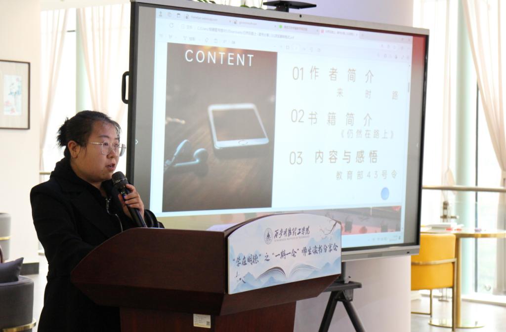 首先,由本次活动分享嘉宾明德科技职业学院辅导员王会霞通过分享书籍《仍然在路上》,谈自己阅读的心得体会。王老师谈到:拿到这本书看完这本书,我就一直在思考,我该怎样去讲述它,目录翻了又翻,内容看了又看,并且深思“我为什么要当辅导员?”这本书的作者曲建武老师,从自己放弃深造、坚持人生的选择和一心一意做好辅导员工作延伸到带着辅导员们回问初心、追根溯源。“一定要把学生培养好”,短短一句话成了伴随作者曲老师一生的初心和坚守。辅导员是距离学生最近的人,大家的一言一行潜移默化地影响着学生的世界观、人生观和价值观,“做好铸魂育人是最有价值的学问,有理想的辅导员才能培养出有理想的人,有信仰的辅导员才能培养出有信仰的人。”辅导员要做理论的践行者,相信教育的力量,努力成为学生成长成才的人生导师和健康生活的知心朋友。