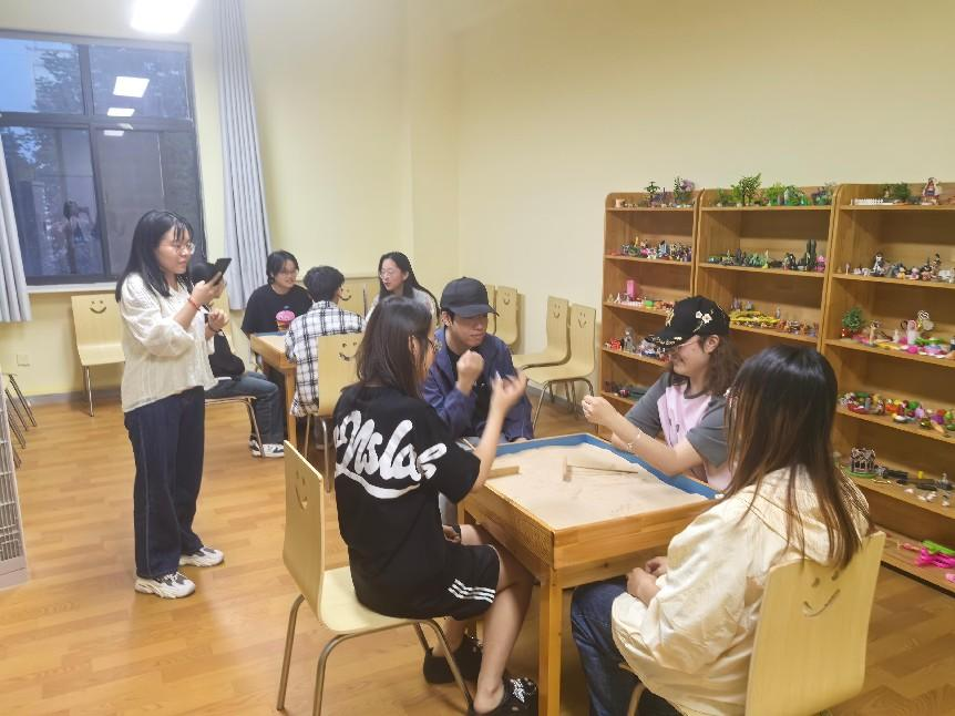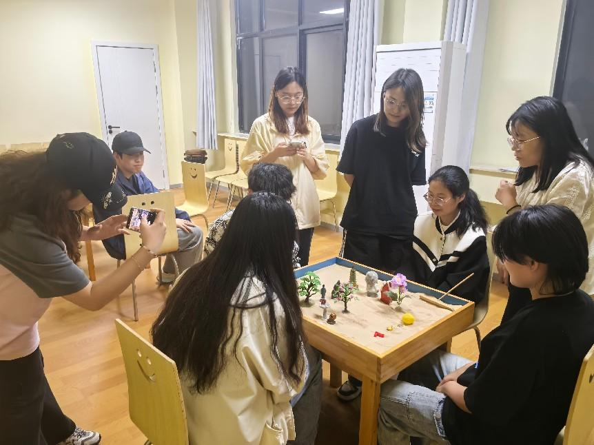 参观结束后,曹源老师以“破冰游戏”引导学生们放松身心,通过非言语的沙盘创作逐步打开心扉。在温馨的氛围中,同学们轮流选取沙具、构建场景,从最初的小心试探到后来的默契协作,沙盘世界逐渐呈现出“无名”“三个好朋友去荒野求生”等主题意象。曹源结合沙盘布局与学生分享,引导大家觉察潜意识中的情感需求,探索人际互动模式,并针对个体困惑给予专业解读。