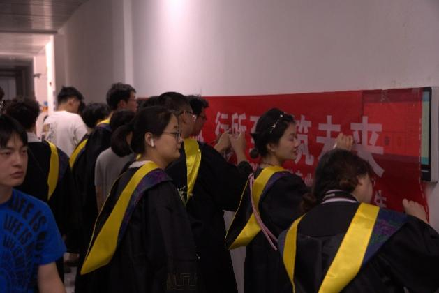 班会伊始,毕业生们在门口“心之旅 梦起航 行所至 筑未来——致2025届计科专业1-6班毕业生”的横幅上郑重签名,留下属于自己的青春印记。随后,一段精心制作的5分钟短视频缓缓播放,从教室认真听讲的身影、实验室专注研究的模样,到操场挥洒汗水的瞬间、图书馆埋头苦读的场景,还有熬夜赶作业的夜晚、短暂而难忘的线下军训、运动会上激情的呐喊……每一帧画面都承载着同学们共同的青春记忆,引发了大家的强烈共鸣。