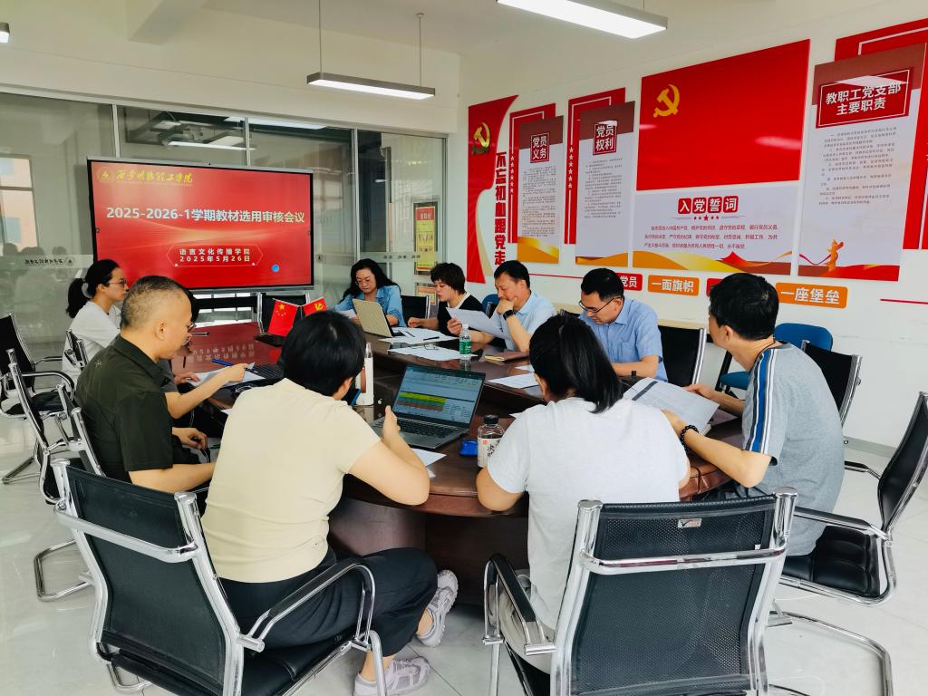 为扎实推进2025-2026学年第一学期教材选用与征订工作,确保教材质量与教学需求精准对接,5月26日上午,语言文化传播学院在明志楼北406会议室召开秋季学期教材选用审核会议。学院院长马庆林、党委书记赵旭东、教学副院长柴芸、刘勇、各专业负责人及相关教务员参会。