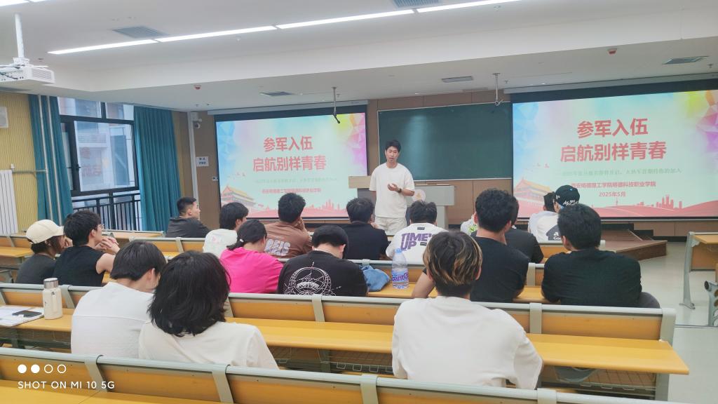 李永帆老师以学校往期参军报国学生、退伍大学生的优秀事迹为切入点,向同学们详细讲述了当前国家对于大学生应征入伍的相关政策。从应征报名、体格检查、政治考核、役前教育以及优待政策等多个方面,为同学们进行了全面且深入细致的解读,并结合身边真实案例进行剖析,阐释政策要点,鼓励同学们积极参与征兵报名,在军队中锤炼自我,为国防事业贡献力量。青春烈火铸荣光,强军征程谱华章。此次宣讲会不仅是对于征兵政策的解读,更是一堂极具感染力的爱国主义教育课程,提供了全面深入了解征兵信息的平台,极大地激发了青年学子参军入伍的热情。接下来,我院将持续推进爱国主义和国防教育体系建设,助力更多学子携笔从戎,在强军兴军的壮阔征程中书写“热血护山河,青春献国防”的时代答卷。