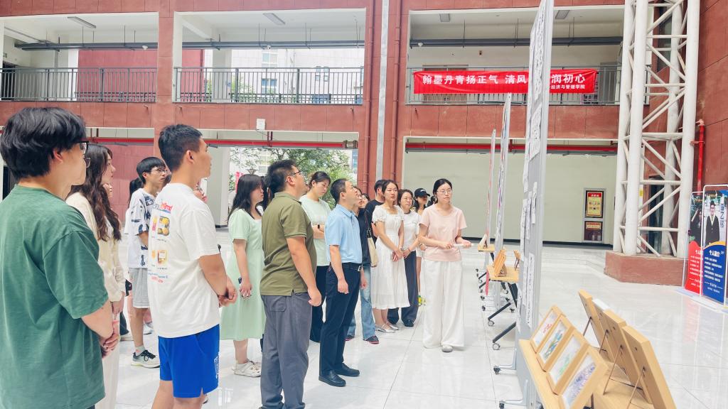 为扎实推进深入贯彻中央八项规定精神学习教育,营造风清气正的育人环境,7月3日,经济与管理学院在明志楼中厅举办“翰墨丹青扬正气 清风化雨润初心”廉洁文化作品展。学院党委书记兼行政副院长何文举、副书记冯纪潮、各党支部书记、支部党员代表在学生第五党支部书记邹代柳的引导下共同参观展览。