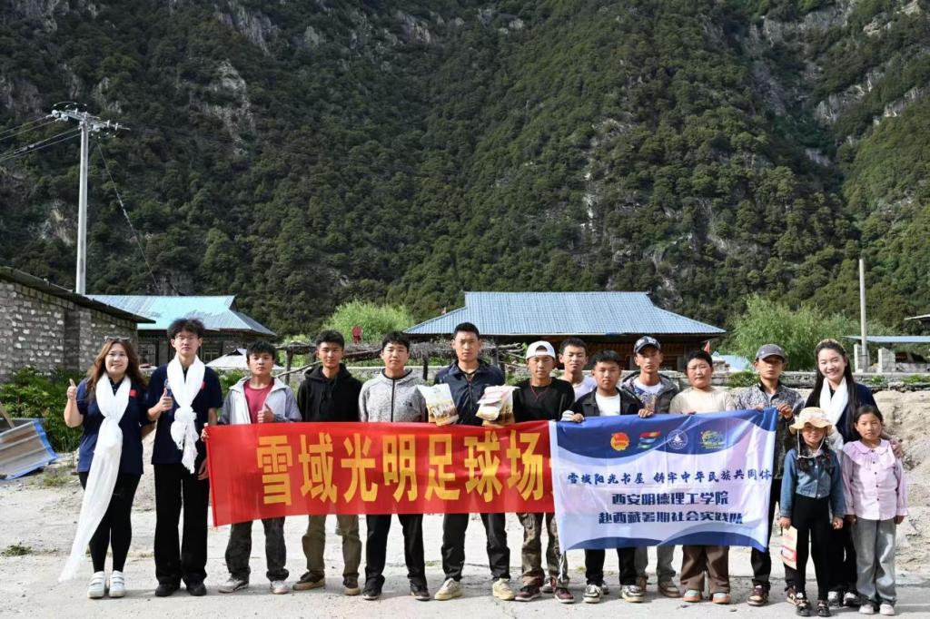 在百名学子访百村活动中,实践队深入巴河镇德觉村实地调研时,了解到当地教育资源匮乏,孩子们渴望规范的运动场地,“想踢球,只能在土路跑,球常滚进沟里”,“在水泥地踢球,裸露的钢筋极易造成伤害”,藏区孩子们的心声深深触动了实践队。为此,2026年国际足联世界杯“雪域阳光书屋·铸牢中华民族共同体”暑期社会实践队联合社会爱心人士筹措资金约三万元,德觉村划拨出一片耕地,为周边几个村落的孩子们共同筹建安全规范的足球场,解决了孩子们踢球的安全隐患。实地调研中,当地孩子们满怀感激地向实践队员献上洁白的哈达表示感谢,足球球门,平地所需水泥等物品已捐助到位,截止目前,球场仍在建设之中。