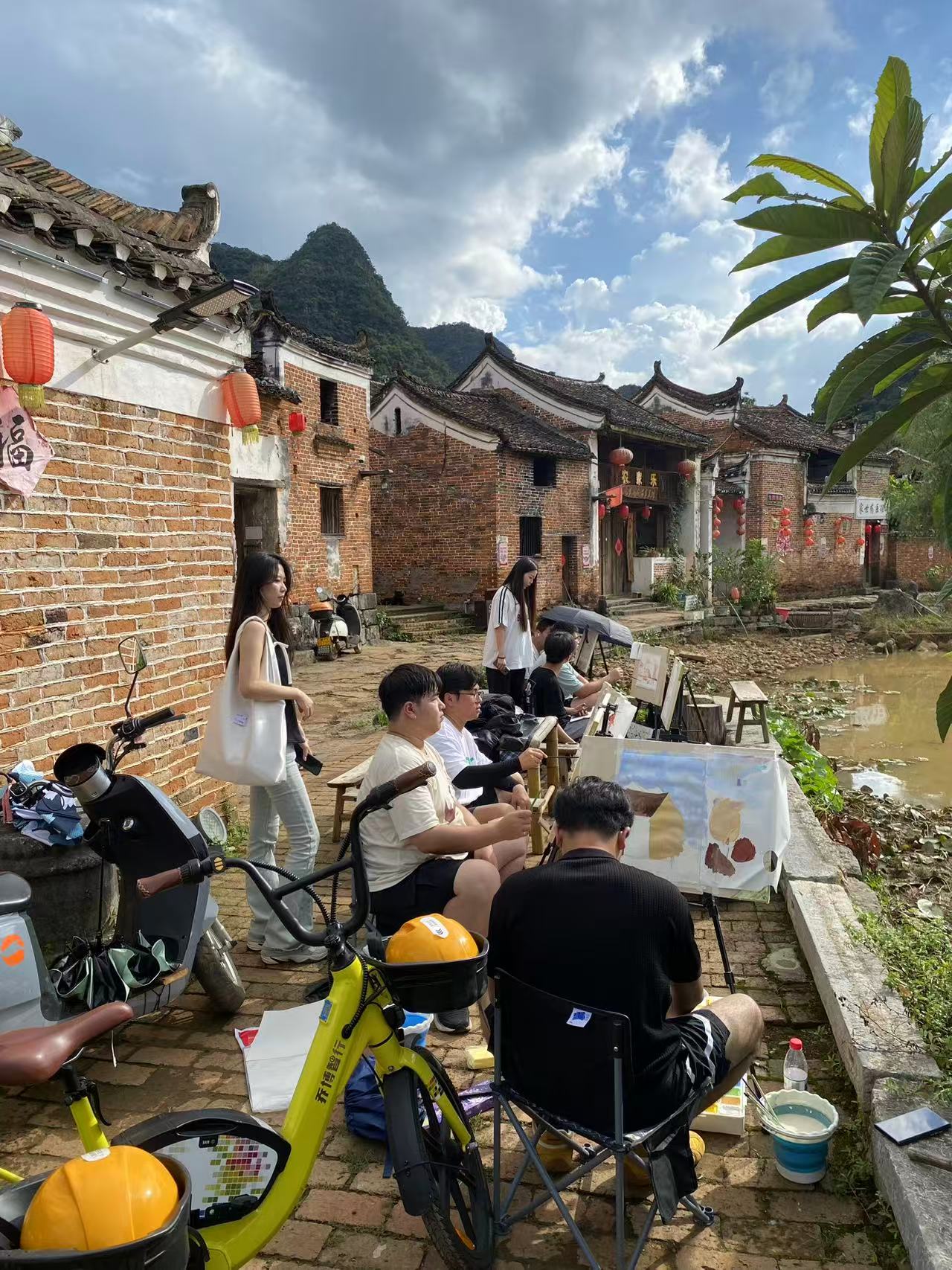 勾蓝瑶寨历史悠久,距今已有800 余年,拥有独特的瑶族建筑风格与淳朴的民俗风情。这里山水相依,青瓦石墙、木窗雕花的古建错落有致,充满了古朴的韵味,为艺术创作提供了丰富的素材与灵感源泉。抵达写生基地后,师生们迅速投入到紧张而充实的课程中。清晨,学生们迎着朝阳,分散在瑶寨的各个角落,支起画板,将眼前的美景用画笔描绘下来。无论是层叠的山峦、蜿蜒的水系,还是飞檐翘角的亭台楼阁、红砖青瓦的明清民居,都成为了他们画布上的主角。在绘画过程中,专业教师们穿梭于学生之间,耐心地进行指导,从构图、色彩搭配到笔触运用,为学生们答疑解惑,帮助他们更好地捕捉自然之美,提升绘画技巧。