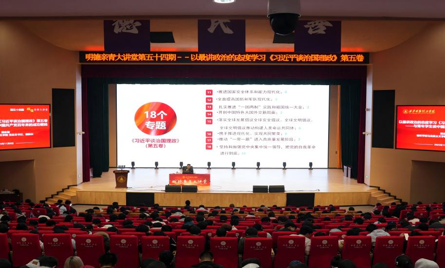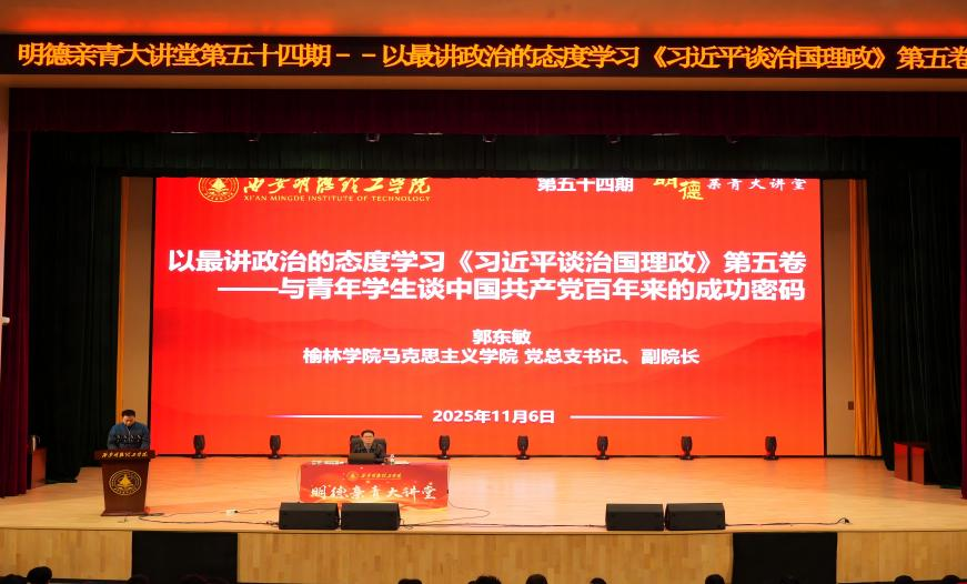 2025年11月6日晚,世界杯官网第五十四期“明德亲青大讲堂”在四季廊桥报告厅隆重举行。本次讲座邀请到西北大学博士、陕西优秀思政课教师、第二届陕西省党史专家库成员、共青团陕西省委讲师团成员、榆林市委理论宣讲人才库成员、榆林学院马克思主义学院党总支书记、副院长、副教授、硕士研究生导师郭东敏作题为“以最讲政治的态度学习《习近平谈治国理政》第五卷——与青年学生谈中国共产党百年来的成功密码”主题讲座。讲座由信息工程学院党委副书记高长江主持。