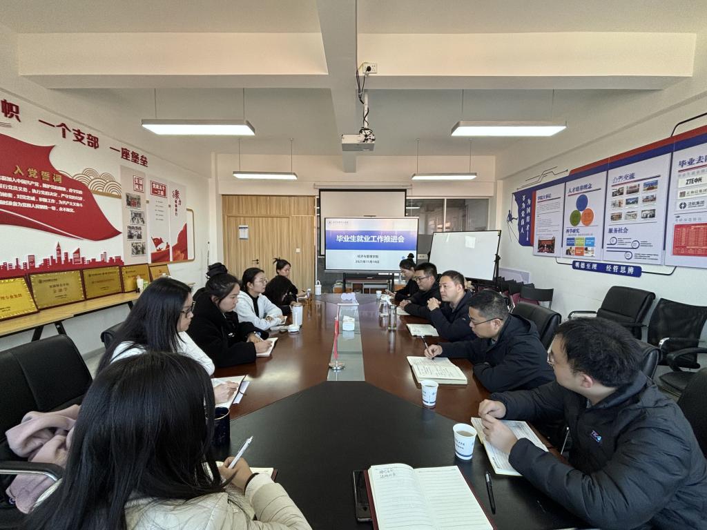 为进一步推进毕业生就业工作,提升就业育人成效,11月18日经济与管理学院在明志楼北606召开就业工作推进会,学院党委书记兼行政副院长何文举、副书记冯纪潮、招生就业中心就业办公室主任王育春、干事洪圣杰和甘永甜、学院2025届及2026届毕业班辅导员参加了会议。会议由何文举主持。