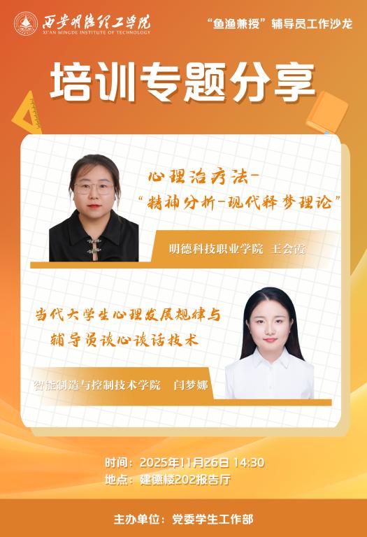 11月26日,学校在建德楼202报告厅以“聚焦心理育人能力提升”为主题举办“鱼渔兼授”辅导员工作沙龙,邀请明德科技职业学院辅导员王会霞和智能制造与控制技术学院辅导员闫梦娜作专题分享。此次活动通过经验交流,共同探讨世界杯官网心理育人能力提升。全校辅导员共同参与了此次活动。