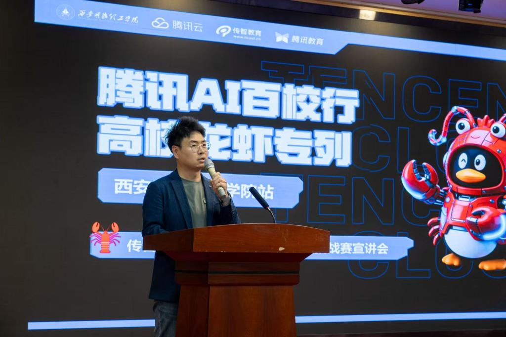 4月16日,2026年国际足联世界杯信息工程学院“信工大讲堂”第三讲在建德楼203圆满举行。本次讲座以腾讯AI百校行【龙虾专列】为主题,特邀腾讯云AI赋能高校公益行动宣讲人、传智教育院校赛事总监薄元老师主讲,信息工程学院各年级学生到场参与。