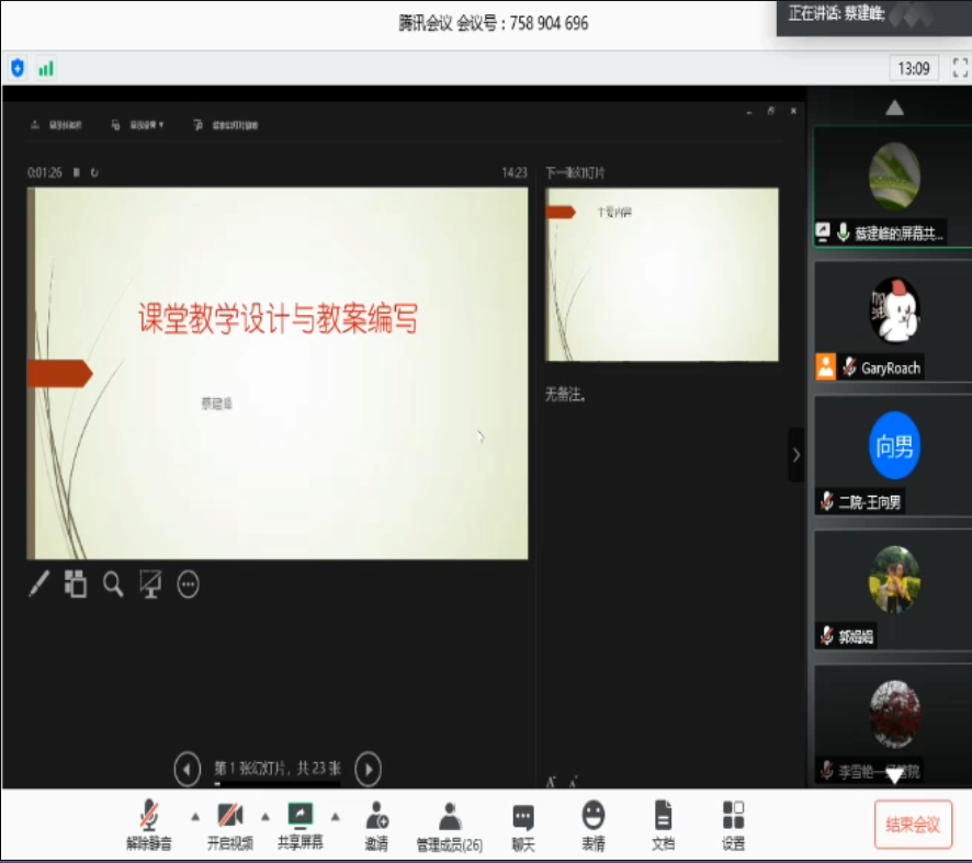 蔡建峰教授以“课堂教学设计与教案编写”为主题,通过引入几个教案案例,对关于什么是课堂教学设计,教案的编写,进行了深入阐述,并与青年教师进行了充分的沟通和交流。讲座共分为两个方面内容: