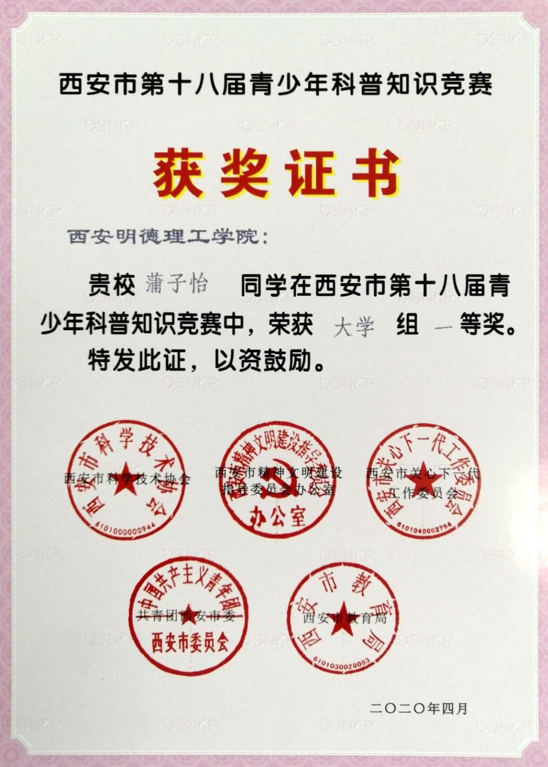经评审,学院荣获第十八届西安市青少年科普知识竞赛“先进单位”;学院高长江、祝卫杰荣获西安市青少年科普知识竞赛“先进个人”,101011802班蒲子怡同学荣获(大学组)一等奖、10311703班王艺伟等2名同学荣获(大学组)二等奖、104021802班宋颖同学等19位同学获得(大学组)三等奖。
