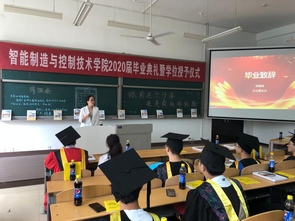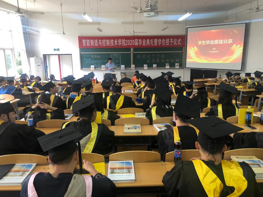 7月12日上午九时,智能制造与控制技术学院在4#教学楼101教室,隆重举行学院2020届毕业典礼暨学位授予仪式。因疫情防控要求,明德学院2020届毕业生毕业典礼暨学位授予仪式在学院明志楼中厅隆重举行,本次典礼采用主副会场加线上直播的方式举行,各二级学院分会场通过新媒体平台对毕业典礼进行了“云”直播。学院副院长朱延波,办公室主任张啭啭,党总支书记陈雪彬,各专业负责人及教师代表,学院2020届毕业生150余人出席了此次分会场的典礼,典礼由毕业班辅导员刘雄主持。