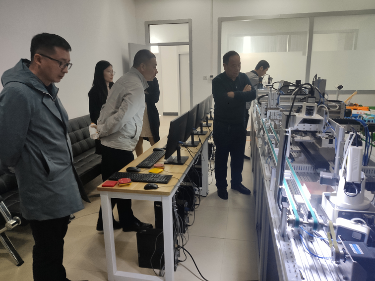 双方就智能工厂实验室建设方面进行了深入探讨与交流,主要探讨了目前智能制造工程行业发展方向,高校智能制造相关实验室的建设现状。重点交流了我院智能制造工程专业,工业机器人传感器课程、运动控制系统、工业控制组态及现场总线技术、PLC课程建设等内容。