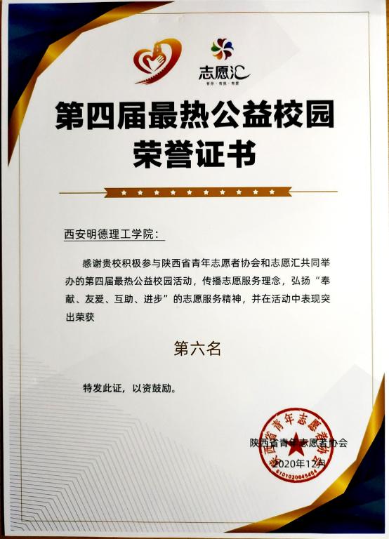 近日,全国“志愿汇”第四届“最热公益校园”活动评选结果出炉,在全校志愿者们积极参与和不断努力下,学院荣获第四届“最热公益校园”第六名的优异成绩。