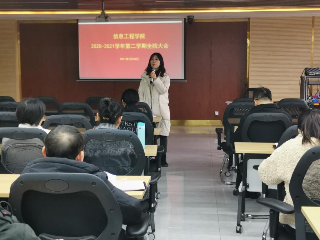 2020年2月28日下午14:00整,信息工程学院在明志楼南311学术报告厅召开了2020-2021学年第二学期全院大会。信息工程学院全体教职工参会,副院长魏瑾主持会议。