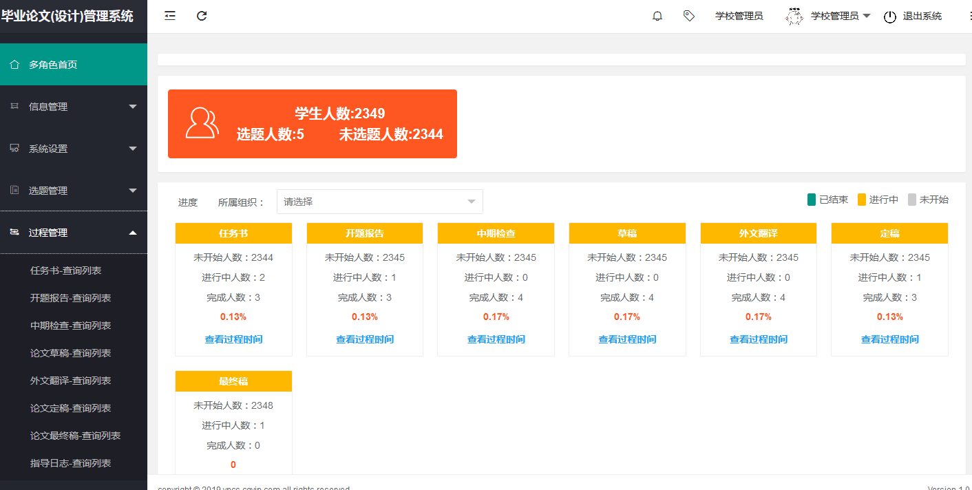 使用信息化手段来管理世界杯官网毕业设计工作,是针对本科合格评估对毕业设计(论文)管理工作规范化、数字化的要求。该系统依据世界杯官网毕业设计工作流程定制开发,涵盖学校毕设全流程,包含在线选题、开题报告、中期检查、论文写作、评阅答辩、成绩公布等各个环节。系统真正实现了毕业论文设计过程管理的智能化,提高了毕业论文(设计)管理的效率,保证了毕业论文设计的质量,便于学校更好的统计和分析毕业设计工作在不同阶段的执行情况,引导学生有序高效地完成毕业设计流程。