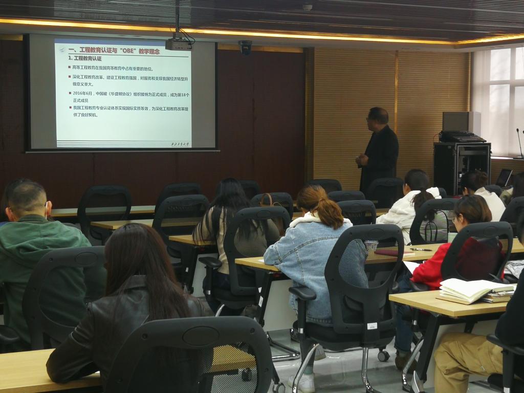 葛老师以基于OBE理念的课程教学大纲的制定为题,介绍新的教学理念,分析本科人才培养体系,联系实际阐述教学大纲在教书育人中的作用。葛老师首先详细说明工程教育认证与“OBE”教学理念。对于OBE关注的问题以及OBE人才培养模式进行总结。之后提出要明晰本科人才培养目标,构建三位一体培养体系。对于人才培养目标定位的内涵及意义进行讲解,对国际工程教育的改革方向作了展望,强调了我国高等教育面临的挑战和变革。葛老师带领大家进一步明确本科教育教学改革的指导思想、应用型本科人才培养体系与教育教学改革的基本原则,联系学校发展现状,提出建设专业化人才培养体系、培养规格及课程体系的具体方案。最后,葛老师对新的教学大纲修订的重点进行了讲解。