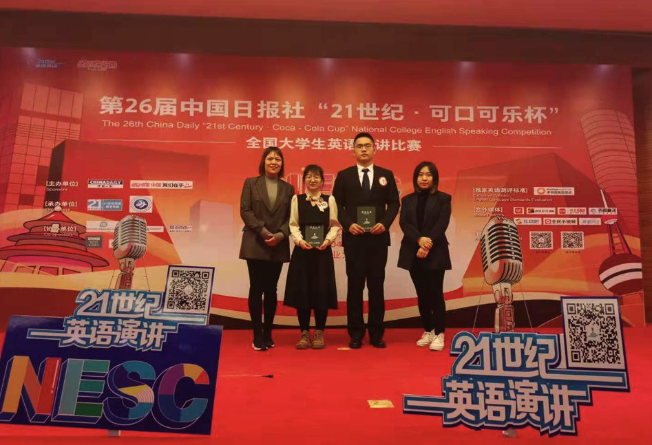 4月14日,第26届中国日报社“21世纪▪可口可乐杯”全国大学生英语演讲比赛陕西赛区决赛在西北工业大学友谊校区落下帷幕。世界杯官网语言文化传播学院英语专业学生蔡青清、张子涵与来自西北工业大学、西安交通大学、西北大学等高校的19名选手同台竞技,喜获两项三等奖。