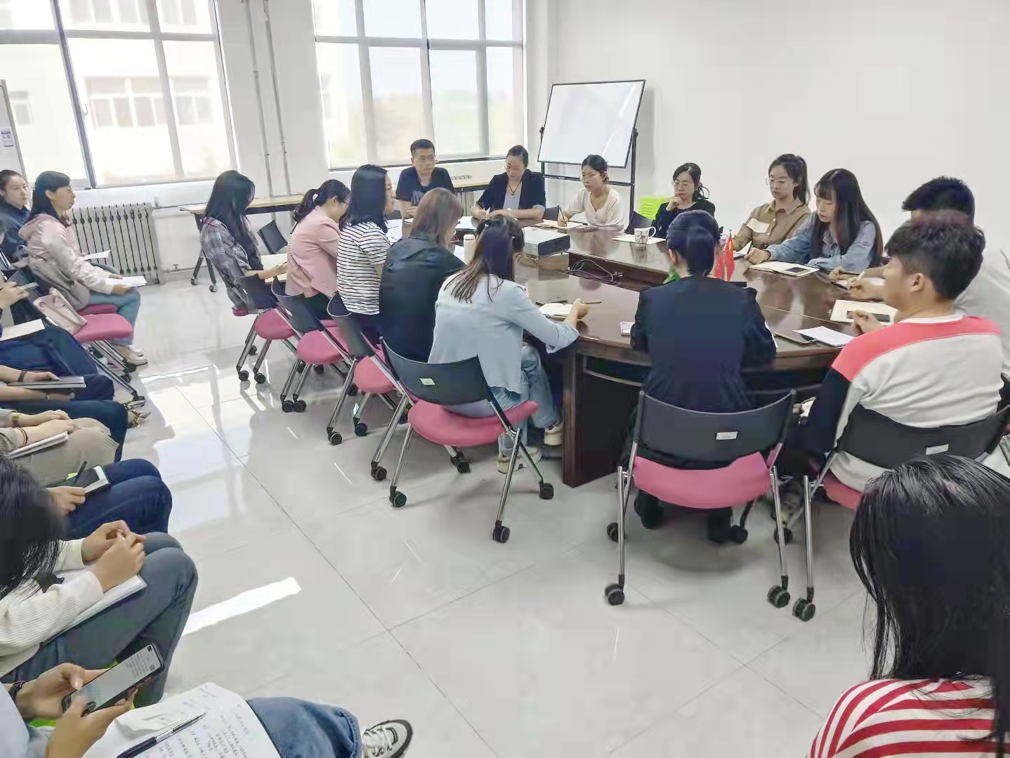 接下来,各学院辅导员老师根据前期收集的学生对于大学英语课程的学习反馈情况介绍了自己所带班级学生情况,结合英语晨读、课堂考勤、晚自习学习氛围等情况,提出希望通过定期电话联系、定期座谈沟通等方式常态交流、群策群力,共同推进学风建设。任课教师和辅导员们还就如何有效维持课堂教学秩序、提升学生英语学习的主动性积极性等问题展开了充分的讨论和交流,纷纷表示在今后的工作中要增进互相交流沟通,优化教学和管理方式方法,有效提升教学效果。