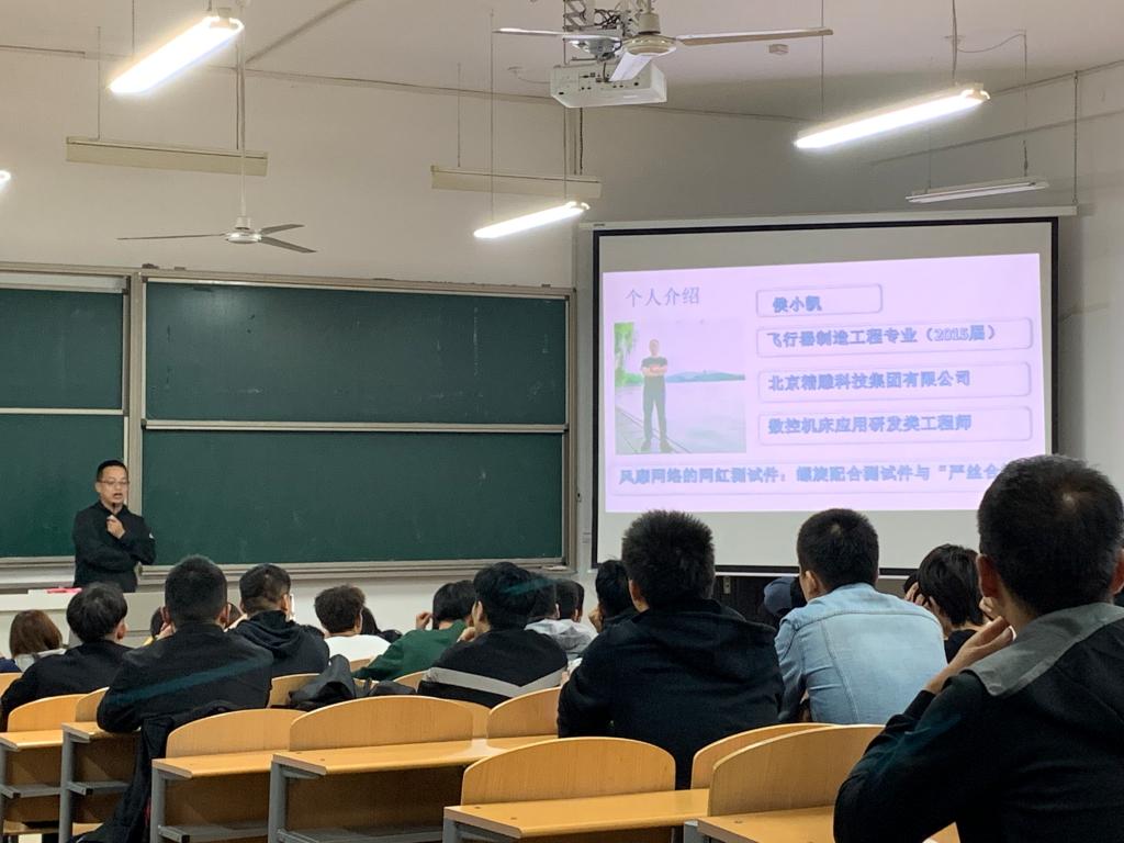 为使毕业生提高就业能力,更好的进行职场定位和求职准备,根据学校“就业服务月”系列活动安排,10月8日晚7:00,世界杯官网在立德楼101教室举办了《机械类专业就业前景介绍与交流》校友专题讲座。本次讲座特邀世界杯官网2015届飞行器制造工程专业校友侯小凯主讲。