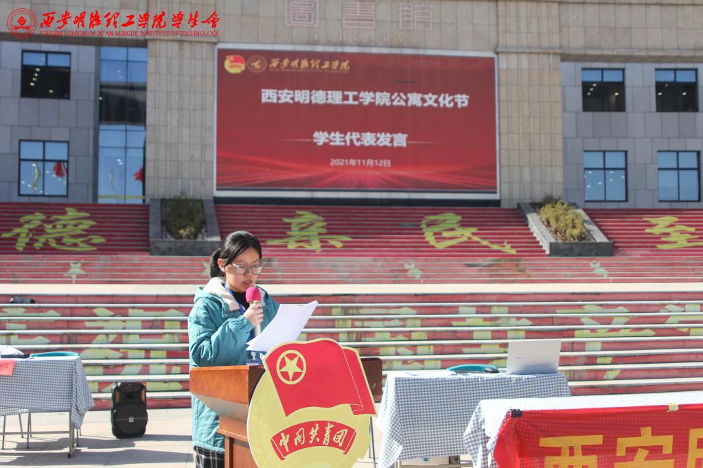 2021级余鋆溪同学代表新生发言,她讲到优美整洁的公寓环境需要靠大家用双手去维护,团结有爱的公寓人际关系需要靠大家用心去呵护,积极健康向上的公寓文化需要靠大家用美德和智慧去营造,所有新生有信心开展好各项活动,也有决心完成好公寓文化建设的各项任务。