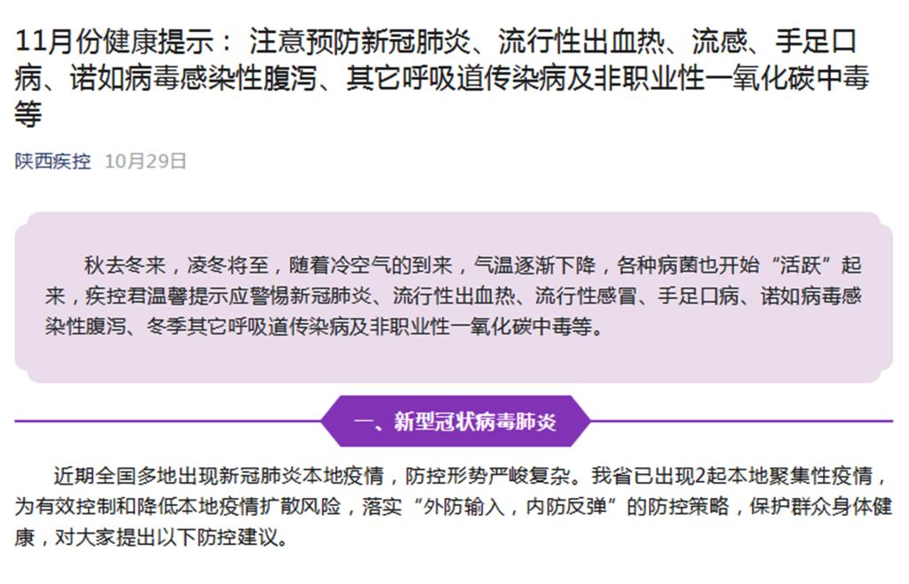 11月15日开始,后勤安保部推出线上宣传教育活动,联合党委学生工作部通过给辅导员推出陕西疾控主办的公众号《11月份健康提示》内容,重点宣传了注意预防新冠肺炎、流行性出血热、流感、手足口病、诺如病毒感染性腹泻、其它呼吸道传染病及非职业性一氧化碳中毒等专业知识。