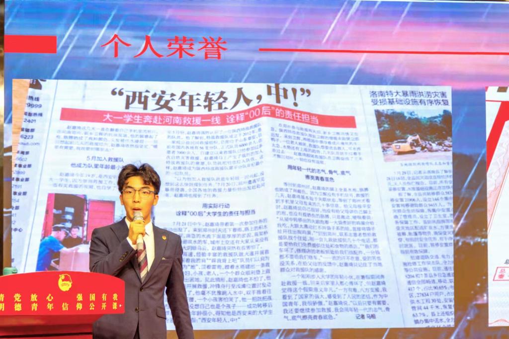 12月2日,“请党放心强国有我”第六季明德青年•信仰公开课第三讲在建德楼203报告厅举行。学校2020级经济与管理学院会计学专业学生、陕西省渭南市富平县特战救援队队员赵嘉琦主讲。学校各级团学组织学生干部参加了本次活动。