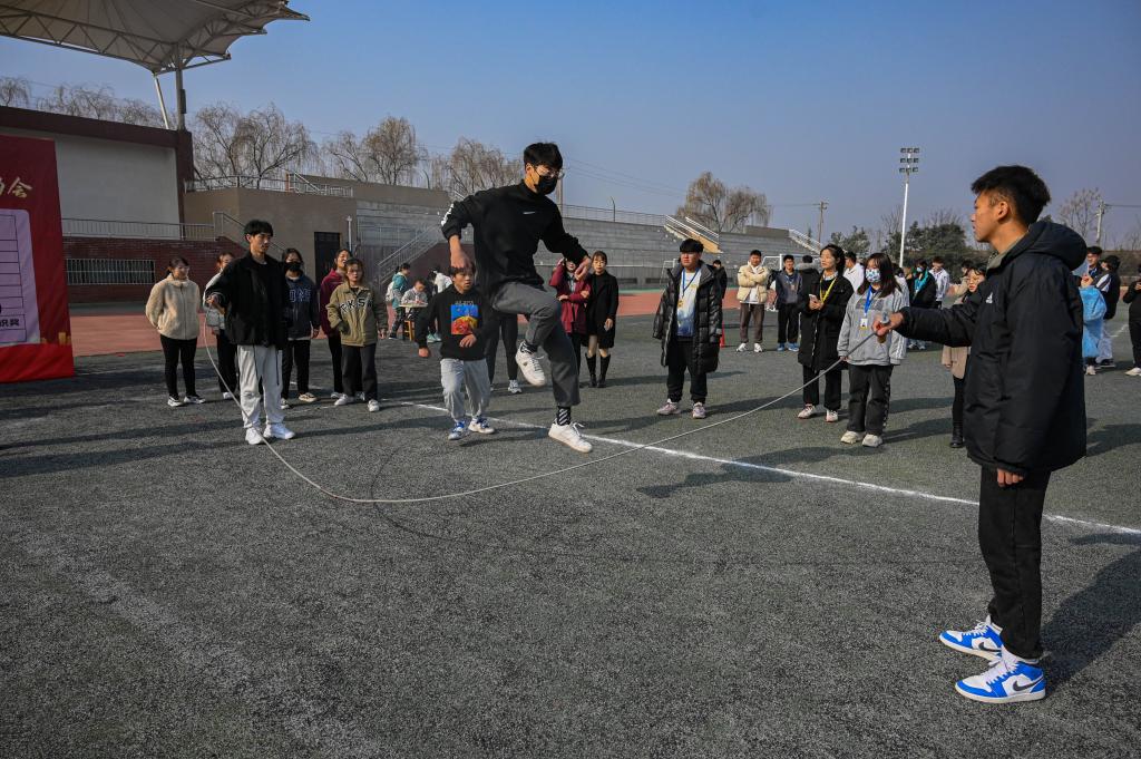 “共同进退多人多足”,是最考验参赛选手团结协作能力与默契配合程度的项目,发令声响起,有的队伍齐喊口号前进,有的稍显缓慢,看似紧张激烈的赛场时不时传来欢声笑语;“齐心协力跳大绳”,每队派出10名参赛选手,2人负责摇绳,8人负责绕“8”字起跳,两名负责摇绳的队友奋力摆动双臂,其他队员则摸索配合调整步调与时机;“斗志昂扬撕名牌”,在保证人身安全的情况下,参赛者们在赛场内追逐争夺对手身上的名牌,有人奋力保护队友,有人勇敢冲锋夺分,现场气氛热烈。最终,经过一番比拼,智能制造与控制技术学院、高等职业技术学院、语言文化传播学院分别获得团体第一、二、三名。