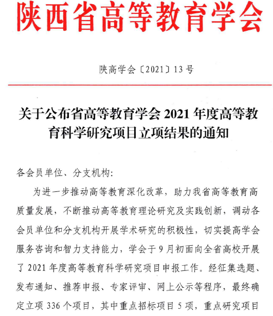 12月6日,陕西省高等教育学会发布《关于公布省高等教育学会2021年度高等教育科学研究项目立项结果的通知》陕高学会〔2021〕13号,世界杯官网立项四项课题,全部由经济与管理学院教师主持或参与。