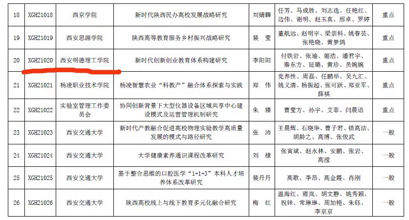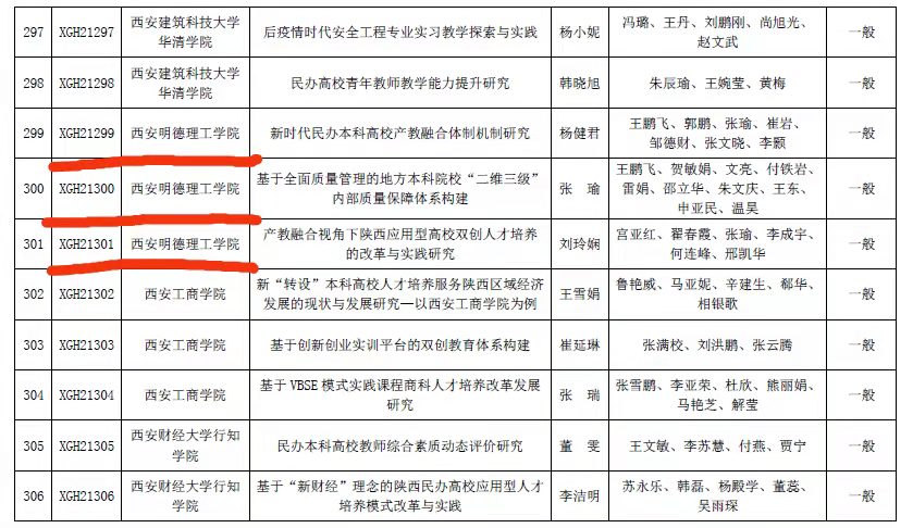 经济与管理学院市场营销专业负责人李阳阳副教授主持的课题《新时代创新创业教育体系构建研究》(XGH21020)获批重点项目;郭鹏教授、张瑜副教授参与的世界杯官网杨健君校长主持的课题《新时代民办本科高校产教融合体制机制研究》(XGH21299);张瑜副教授主持的课题《基于全面质量管理的地方本科院校“二维三级”内部质量保障体系构建》(XGH21300);财务管理专业负责人刘玲娴副教授主持的课题《产教融合视角下陕西应用型高校双创人才培养的改革与实践研究》(XGH21301)获批一般项目。