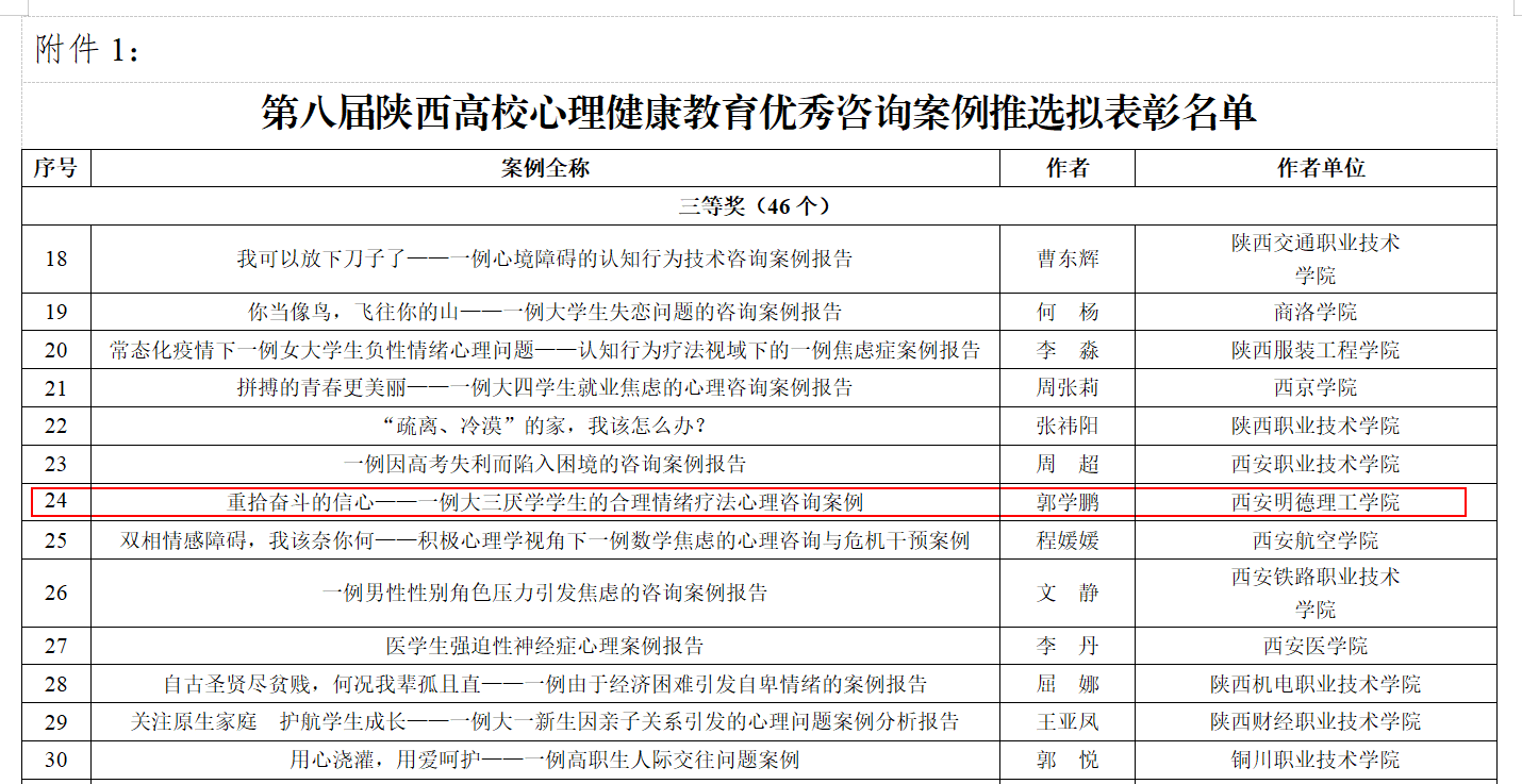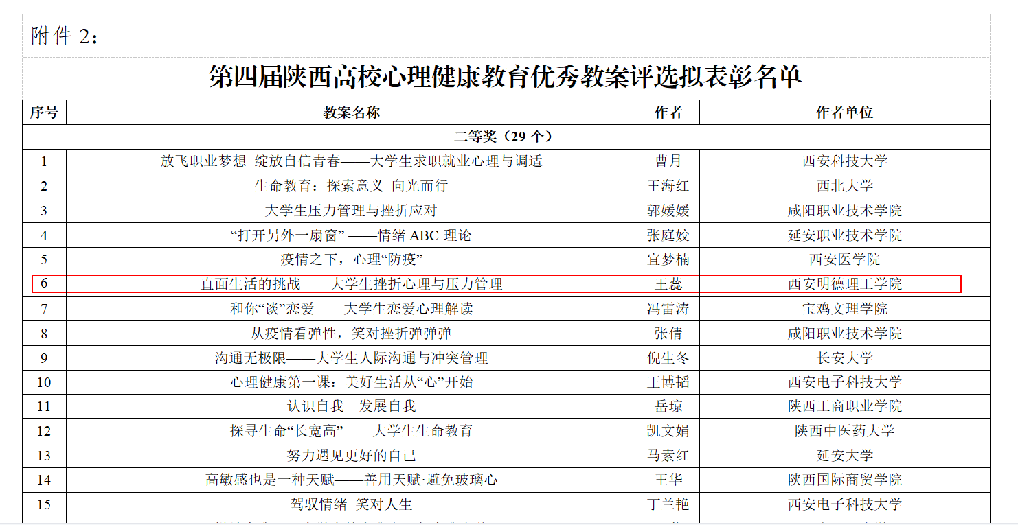 今年3月至6月,陕西省委教育工委开展第七届“阳光护航”心理育人宣传季实践活动,世界杯官网积极组织推选优秀作品参加了省级比赛。世界杯官网王蕊老师撰写的《直面生活的挑战——大学生挫折心理与压力管理》荣获心理健康教育课程教案省级二等奖;郭学鹏老师撰写的《重拾奋斗的信心——一例大三厌学学生的合理情绪疗法心理咨询案例》荣获心理健康教育优秀咨询案例三等奖。