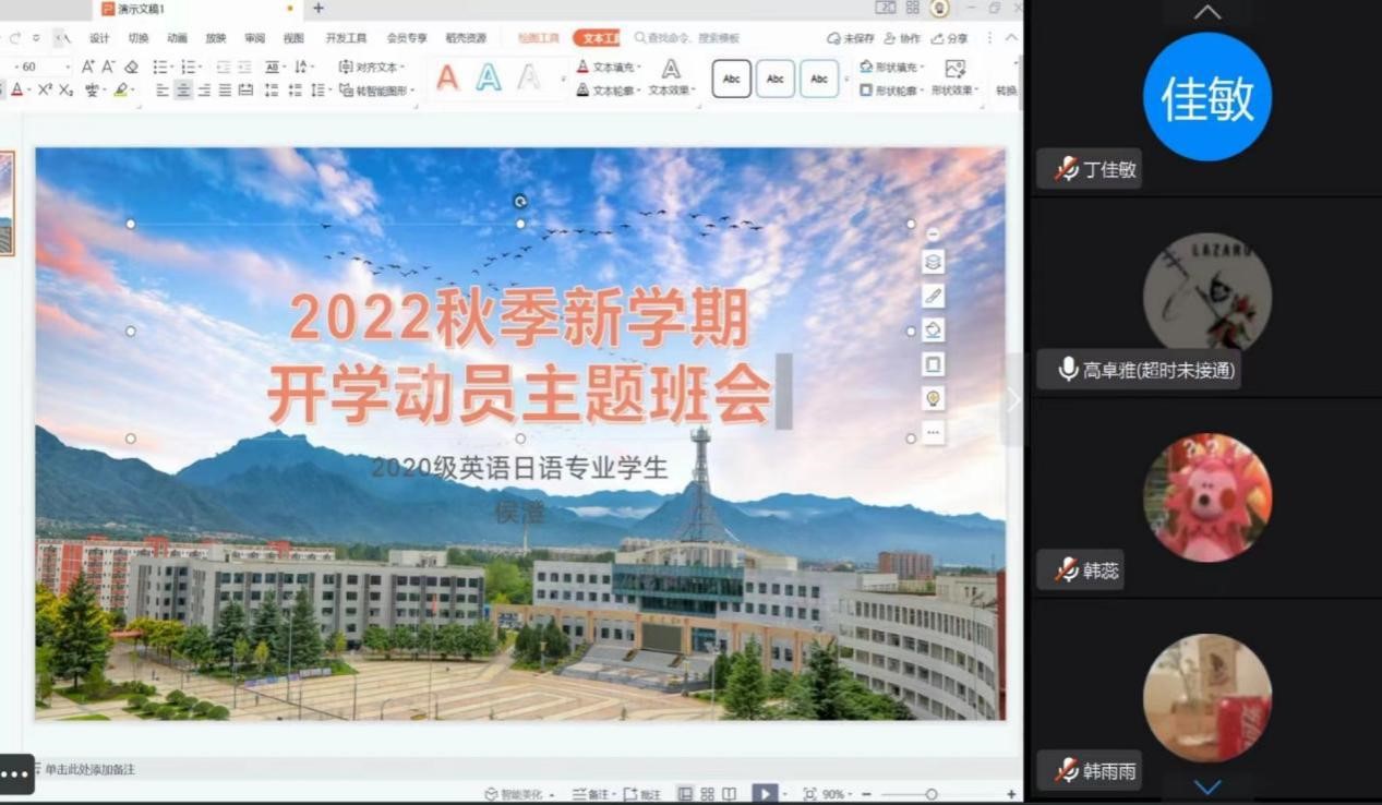 为迎接新学期,进一步做好学生的思政教育,加强疫情防护意识,提高安全意识和自我保护能力,语言文化传播学院全体辅导员在线上开展了2022年秋季“开学第一课”的动员班会。