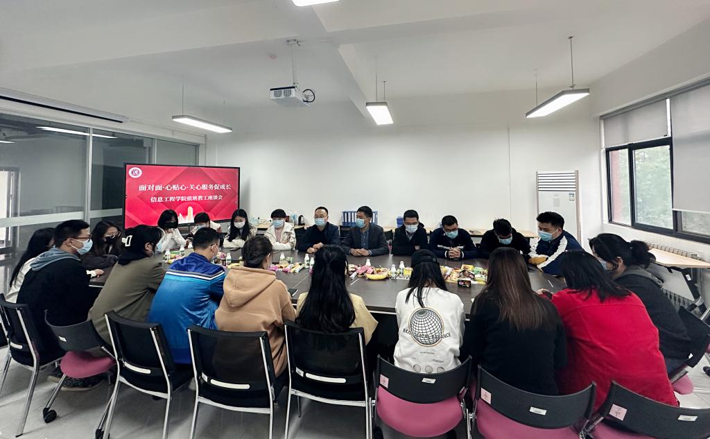 为建设一支专业、稳定、精干、向上的学工及管理团队,增强凝聚力、向心力,更好服务学院发展,服务学生成长。10月13日下午,信息工程学院在明志楼北206会议室召开“面对面·心贴心·关心服务促成长”教职工座谈会。学院党委书记肖千春,副书记高长江,办公室主任尹莹及在校教学管理、学生管理等20余名教工参加座谈。