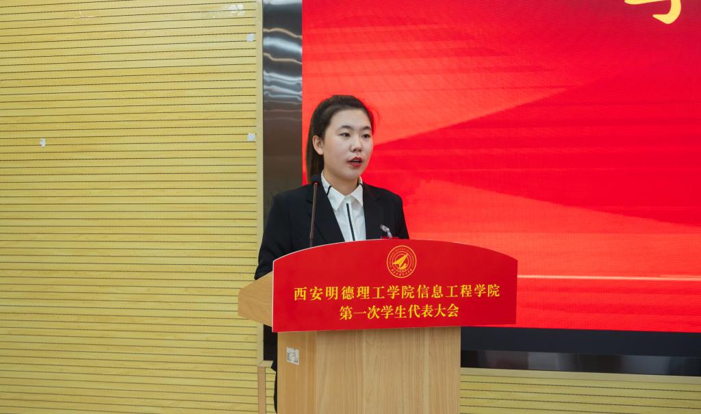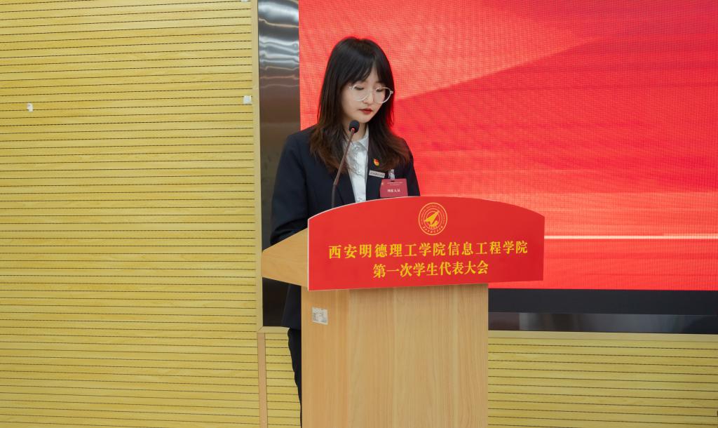 院学生会主席团成员李怡萱代表学院上一届学生会以《不忘初心跟党走,踔厉奋发新征程,团结带领广大同学在全面建设社会主义现代化强国的火热实践中贡献明德信工力量》为主题作了工作报告。