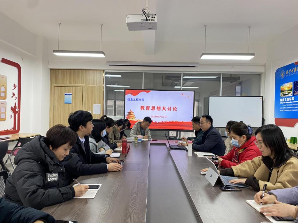 为深化党的二十大精神专题学习班培训成果,贯彻落实学校党委“务必不忘初心 牢记使命”理论中心组扩大学习会会议精神。2月22日下午,信息工程学院深入开展教育思想大讨论活动。学院领导班子成员、各专业负责人、办公室主任、党委副书记及教师代表参加。活动由王丽芳院长、肖千春书记共同主持。