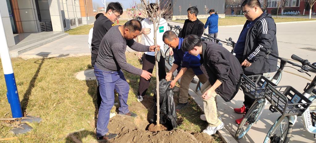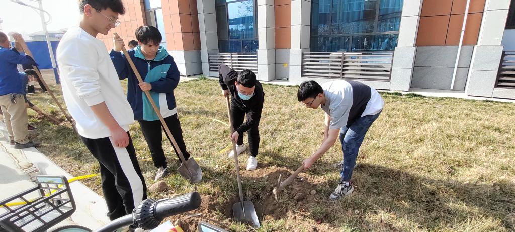 在植树活动前,支部书记王旭光对参与活动的全体人员进行了分工,并叮嘱大家在保障个人安全的前提下开展实践活动。随后,大家有序领取劳动工具,在后勤管理处老师的指导下进行刨坑、扶苗、填土、浇水。大家热情洋溢、干劲十足,各环节衔接有序,师生配合默契,气氛愉悦欢快。