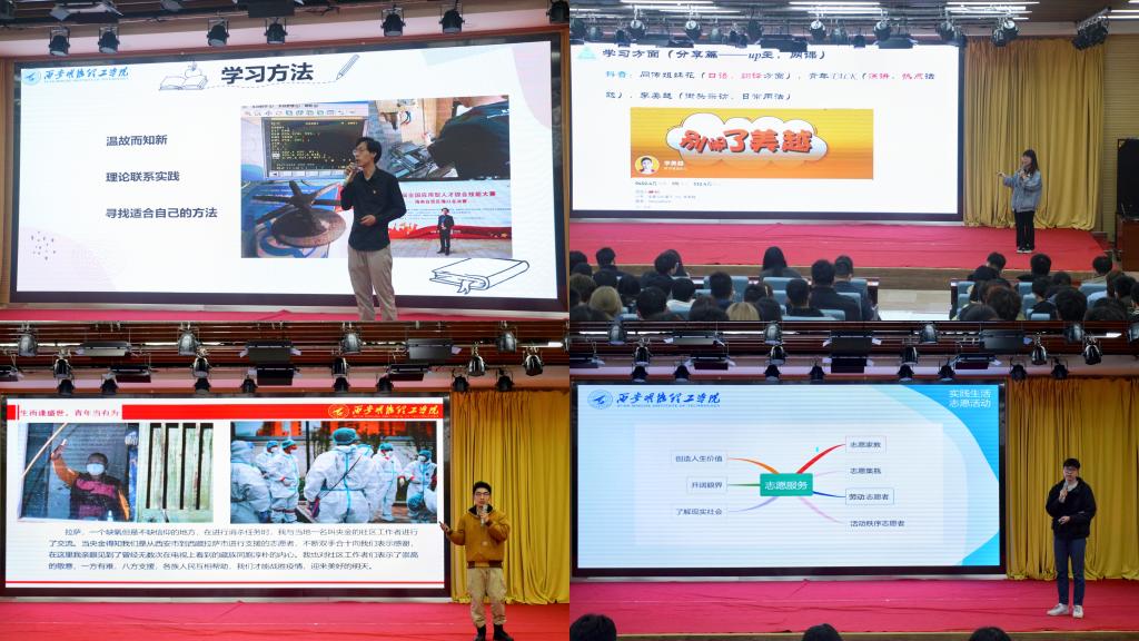 报告会上,四位优秀大学生分享了自己大学生活的体验与感悟。智能制造与控制技术学院孙一辰从如何做好一名优秀的学生干部并努力实现自我价值,分享了他在开展学生工作中的经验和方法;语言文化传播学院的王鑫仪从“勤为径,苦作舟”谈到单词记忆、语法学习的方法,并给学弟学妹们介绍了自己学习英语的软件和课程;经济与管理学院赵嘉琦以“生逢而盛世,青年当有为”为主题,谈及当代大学生如何坚持理想信念,筑造成功的道路;经济与管理学院的李纪赫从如何开始预习、找重点、记笔记以及练习谈到自己学习数学的方法,讲到了如何应试到参加学科竞赛的心路历程。在明德的青春岁月中,他们努力发掘自我价值,为学校带来荣光,为青春增添色彩。