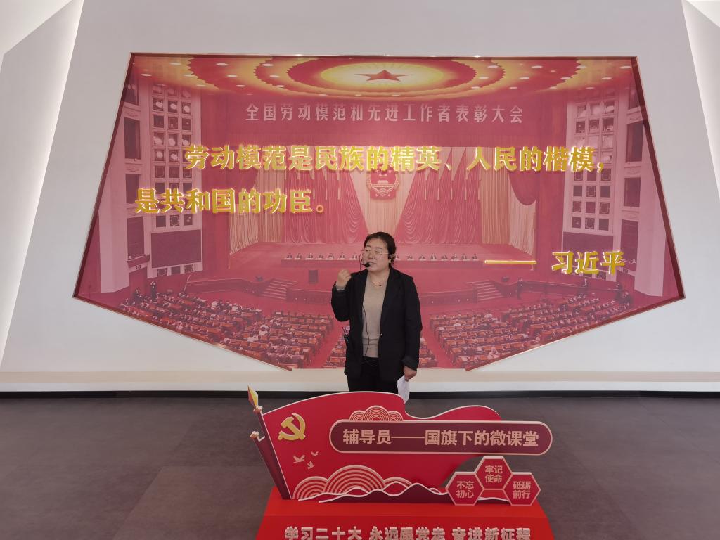 参观学习结束后,由学校高等职业技术学院辅导员王会霞以“赓续红色血脉,传承劳模精神——筑牢高校思想政治辅导员“工匠精神”为题,讲到学生就是未来实现中华民族伟大复兴的主力军,辅导员就是打造这支中华民族“梦之队”的筑梦人。倡议全体辅导员当不负时代的使命与责任,在自己所在的领域,发光发热。以劳模为榜样,把劳模精神、劳动精神、工匠精神作为勇往直前的精神力量,为培养德智体美劳全面发展的社会主义建设者和接班人贡献个人力量。