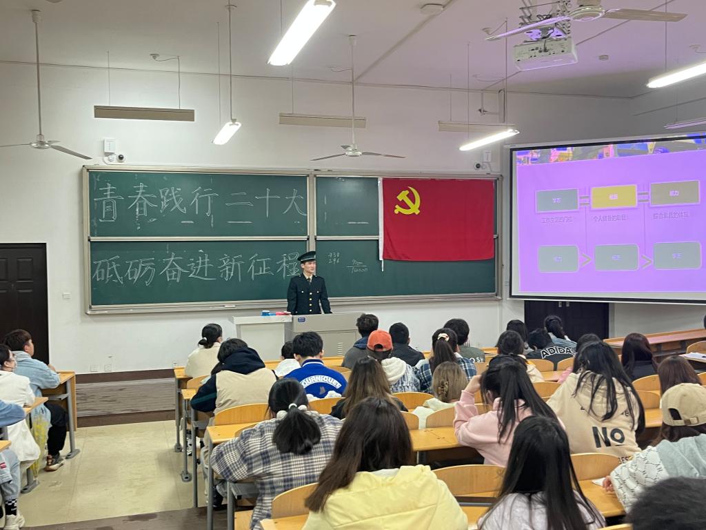 课上,吕盼以“依法服兵役,从军最光荣——青春之我践行二十大精神”为题,从当兵的十大好处、征兵入伍条件、征兵入伍流程三个方面讲述了大学生参军入伍政策及意义,鼓励符合入伍条件且有意愿参军入伍的学生积极报名,支持国防和军队建设;学生高曹骜分享了个人应征入伍期间的军旅生涯,让同学们亲切地感受到军旅生活的丰富多彩,激励青年同学们当先进,争标兵;学生华中天从端正学习态度、明确学习目标、勇攀学业高峰等方面分享了自身从最开始的默默无闻到最终考入诺丁汉大学的奋斗故事。课堂上,师生互动频繁,气氛热烈,让现场的同学们收获颇丰。