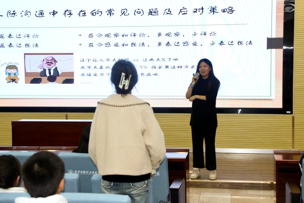 启动仪式结束后,学校心理健康中心朱妍老师为现场师生们做了题为“人际沟通与自我表达”的专题辅导,她以幽默的讲解方式为同学们介绍了什么是人际沟通,人际沟通的重要性,如何学会正确的沟通,帮助同学们就日常生活中遇到的心理问题答疑解惑,现场气氛热烈融洽。