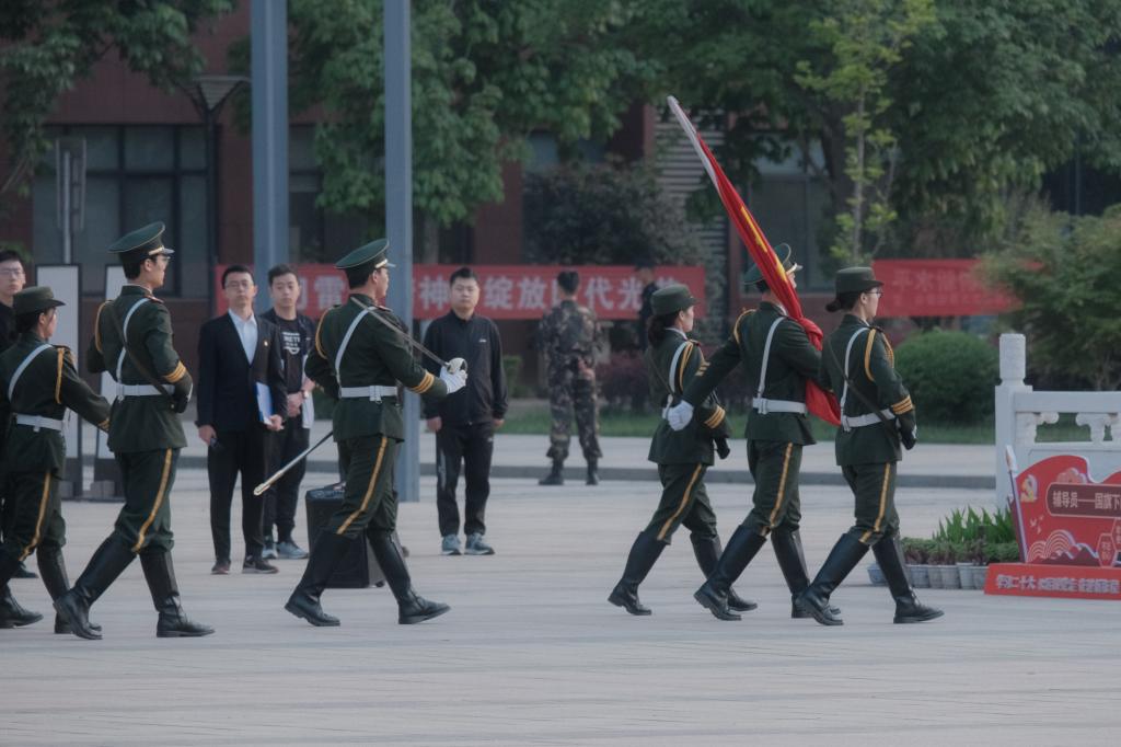 上午七时整,国旗护卫队精神饱满、英姿勃发,以铿锵有力、整齐划一的步伐护送五星红旗走向升旗台。伴随着庄严的《义勇军进行曲》,五星红旗迎着朝阳冉冉升起,全体师生肃立,齐唱国歌,行注目礼。