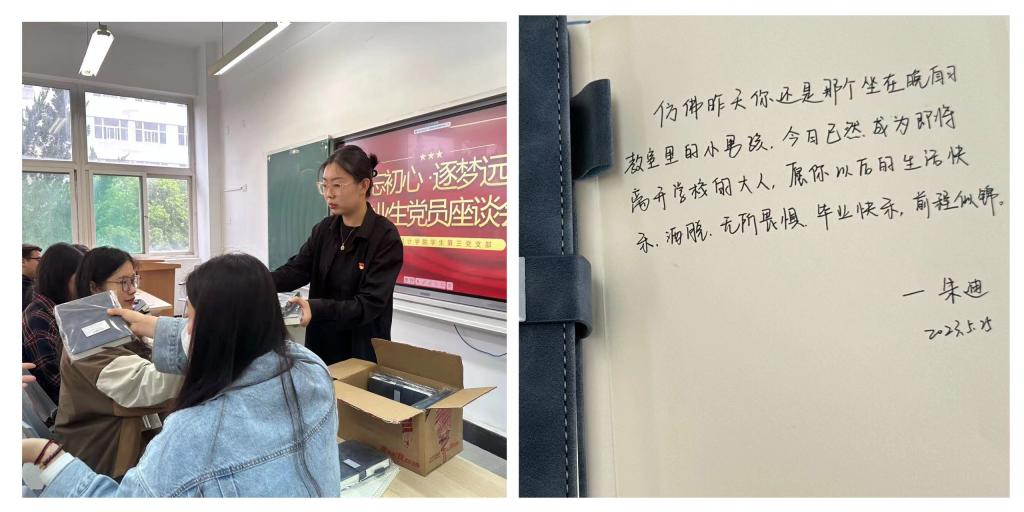 活动中,毕业生党员分享了近期服务班级同学情况与毕业打算。学生党支部书记向毕业生党员传达了毕业离校工作安排,强调毕业生党员组织关系转接工作的重要性,号召大家在做好毕业离校工作的同时,也要积极地为班上的同学服务,并为每位毕业生党员赠送笔记本,书写毕业寄语,以此留念,勉励毕业生党员们坚定理想信念,鼓励大家把身份亮出来,作用发挥出来,持续在就业创业、文明离校以及其他毕业离校工作中发挥先锋模范作用。